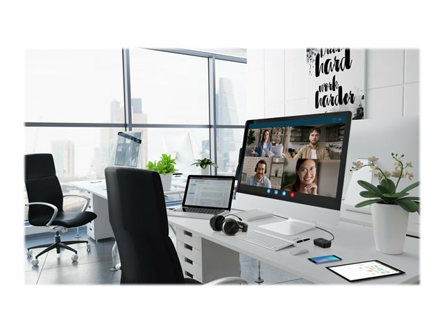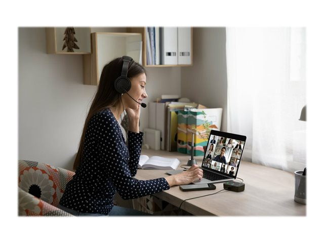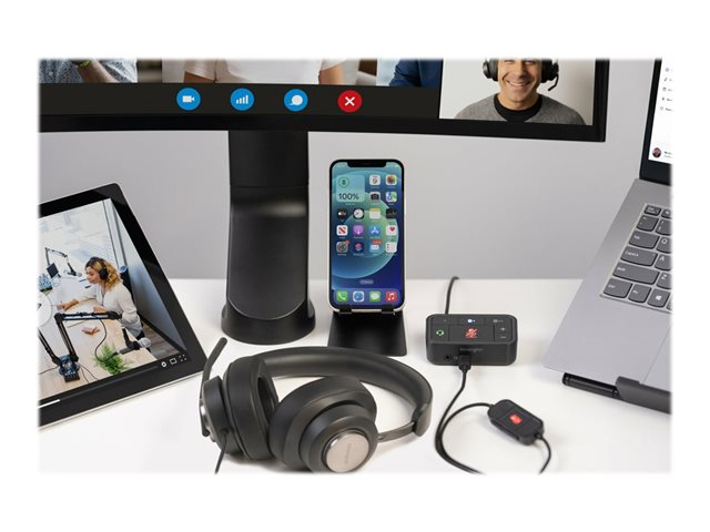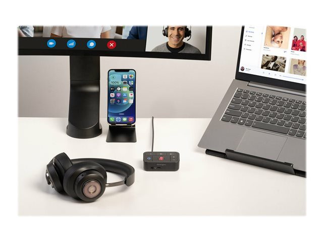 Les professionnels travaillant au bureau, à domicile ou en déplacement ont fréquemment besoin de passer d'une source audio à une autre depuis leur ordinateur portable, leur téléphone ou d'autres appareils. Qu'il s'agisse de répondre à un appel vidéo, de passer un appel téléphonique ou d'écouter de la musique, le basculement entre différents appareils peut être long et complexe. Notre switch audio 3 en 1 permet aux professionnels d'utiliser un même casque filaire ou sans fil tout en basculant entre trois sources audio différentes. Les utilisateurs peuvent facilement basculer entre leur ordinateur portable, leur téléphone ou leur tablette, ce qui leur permet d'augmenter leur productivité. Compatible avec de nombreuses plateformes, telles que Microsoft Teams, Google Meet, Zoom et WebEx, le switch audio 3 en 1 professionnel pour casques offre une expérience audio professionnelle grâce à ses boutons de commande pratiques permettant la commutation des appareils, le contrôle du volume et la désactivation du son.
