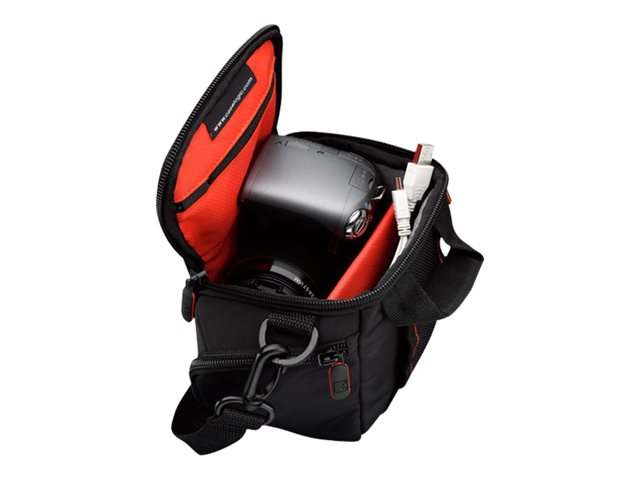 Doté de détails rouge vif, cet étui pour appareil photo est conçu pour la plupart des appareils photo hybrides et appareils photo numériques grand zoom. Les options de transport comprennent une boucle de ceinture pratique ou une bandoulière amovible. Il est également pourvu de rangement pour vos câbles et accessoires.