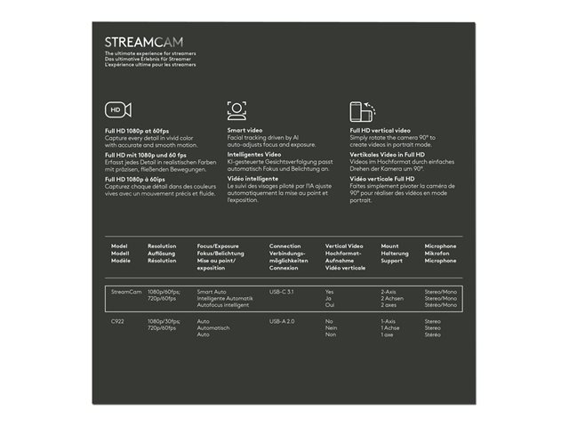 Faites passer votre contenu au niveau supérieur et partagez votre passion grâce à la caméra StreamCam. Dotée d'une qualité d'image irréprochable, de deux microphones à l'avant, d'options de montage polyvalentes et de la connectivité USB-C, il s'agit de la caméra idéale pour la diffusion sur vos plateformes de streaming préférées. Il vous suffit d'être vous-même! Compatible avec Windows et Mac.