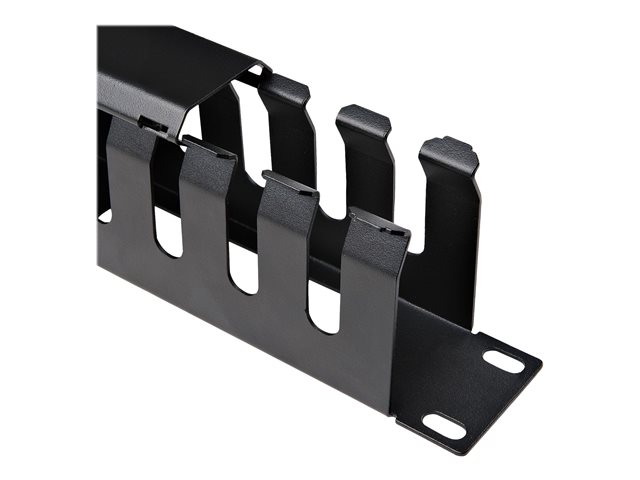 Ce gestionnaire de câbles comporte une plaque supérieure, qui permet de facilement ajouter ou retirer les faisceaux de câbles. La gaine présente également une série de doigts de chaque côté ainsi que des orifices situés au dos par lesquels vous pouvez acheminer vos câbles pour les placer à l'endroit désiré tout en réduisant la tension au cours du processus.
