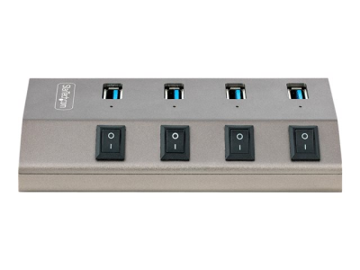 Ce hub USB 3.2 Gen 1 (5Gbps) à 4 ports ajoute quatre ports USB de type A à un ordinateur, avec l'avantage supplémentaire que chaque port dispose d'un interrupteur marche/arrêt individuel. Le hub USB est auto-alimenté par l'adaptateur d'alimentation fourni. Il se connecte à un port USB-A, ou USB-C sur un ordinateur portable ou de bureau.